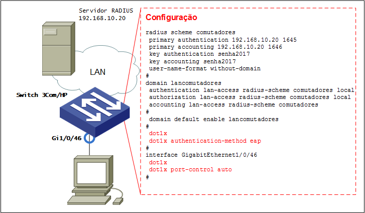 Neste, post forneceremos apenas a configuração de um Switch HP com o Comware 5. As configurações do suplicante e do Servidor de autenticação devem ser verificadas na documentação dos seus respectivos SO.