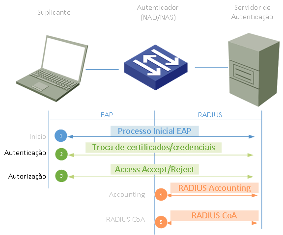 No cenário acima, o cliente (suplicante) inicia a autenticação; após a troca de certificados e credenciais, o servidor autoriza o usuário enviando uma mensagem RADIUS Access-Accept ao NAD. Uma vez o usuário autenticado, o NAD enviará atualizações de accouting RADIUS para o servidor para atualizá-lo com informações da sessão do usuário: como largura de banda, tempo da sessão etc.