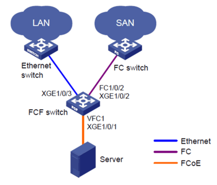 No cenário abaixo, mostraremos a configuração no Comware para as interfaces TenGigabitEthernet 1/0/1 para o servidor com CNA (conectividade FCoE), TenGigabitEthernet 1/0/2 ou FC1/0/2 para rede SAN e TenGigabitEthernet 1/0/3 para rede LAN.